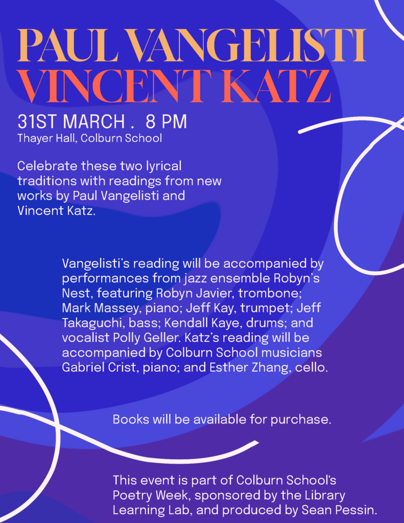 Collaborators: Debbie Smith, Paul Vangelisti, Vincent Katz, Gabriel Crist, Esther Zhang, Robyn’s Nest (Robyn Javier, Mark Masset, Jeff Kay, Jeff Takaguchi, Kendall Kaye), Polly Geller, Grace Muller, Hanna Davis